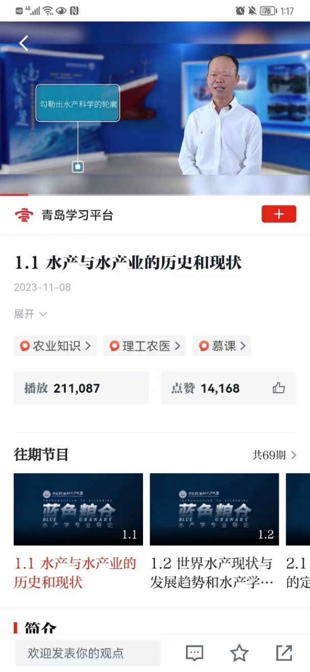 由麻豆av 麦康森院士总策划,温海深教授总负责,21家全国新农科水产教育联盟单位共同建设的视频课程《蓝色粮仓-水产学专业导论》,2023年11月8日在“学习强国”上线并面向社会开放,从而为高校师生和广大社会学习者提供优质学习资源,距离上线不到2个月的时间,本课程总播放量超过130万次,点赞数超过6万。