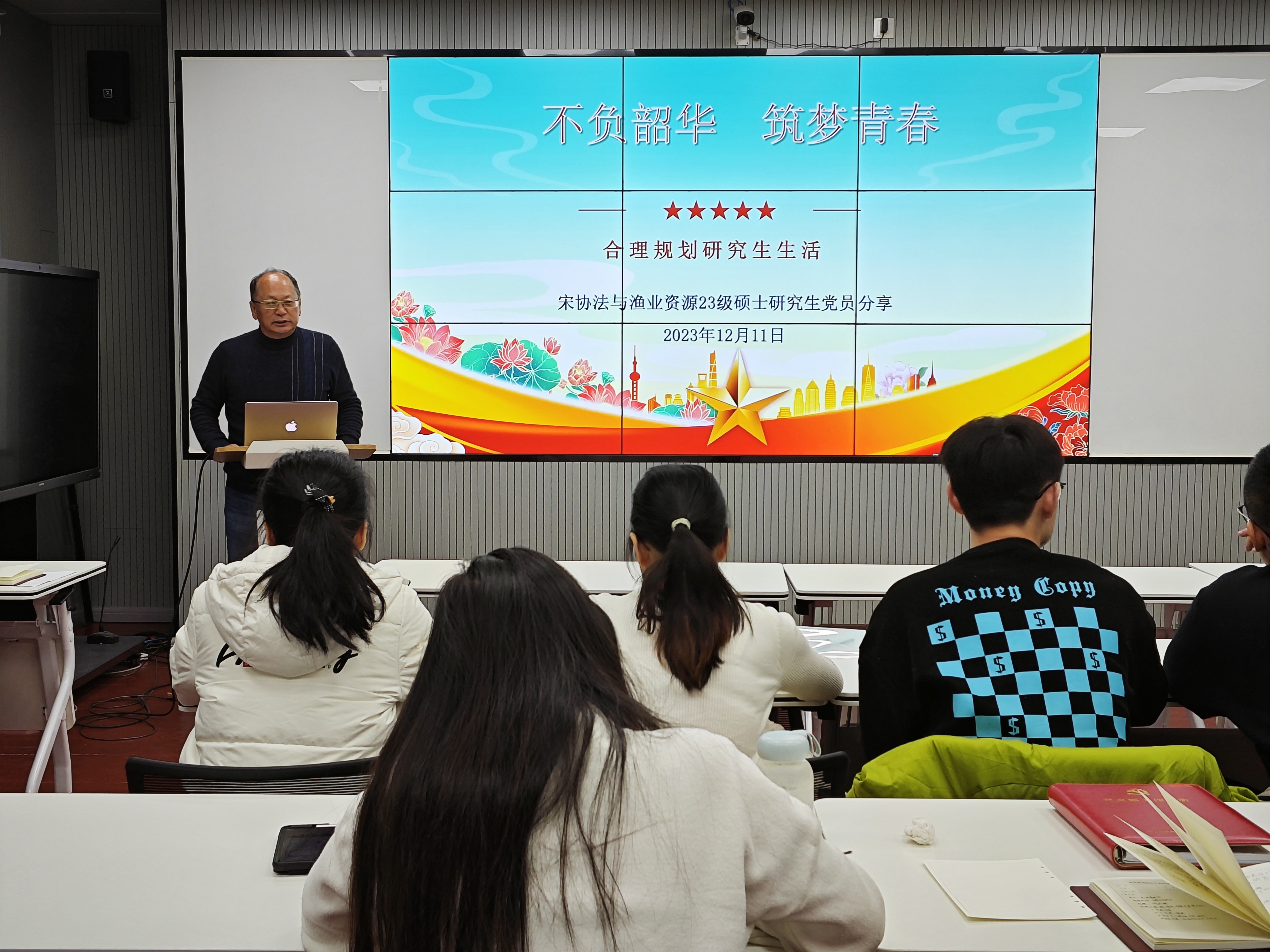 2023年12月11日下午,2023级渔业资源硕士麻豆av 党支部在铭史楼302举办“对话党员导师”主题党日活动。支部党员导师、副院长宋协法教授为渔业资源硕士党支部全体党员讲授题为“不负韶华,逐梦青春”的专题党课。