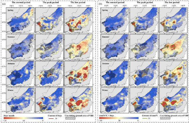 针对这一问题,研究团队聚焦西北太平洋重要经济物种太平洋褶柔鱼,综合利用2014至2023年间的卫星夜间灯光遥感数据与随机森林模型,解析了海洋热浪对该物种渔业活动空间格局的影响机制。研究首次明确了驱动渔场显著变化的关键阈值:当海洋热浪持续时间超过16天,或其累积强度达到50°C·天时,传统核心渔场将出现显著收缩。这一效应在夏秋季尤为明显。统计分析进一步证实,热浪强度与渔获量、作业分布范围均呈显著负相关,表明极端高温事件正直接压缩渔业生产空间。