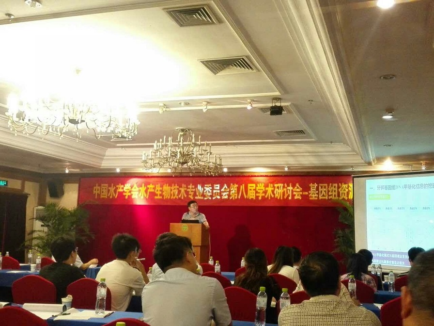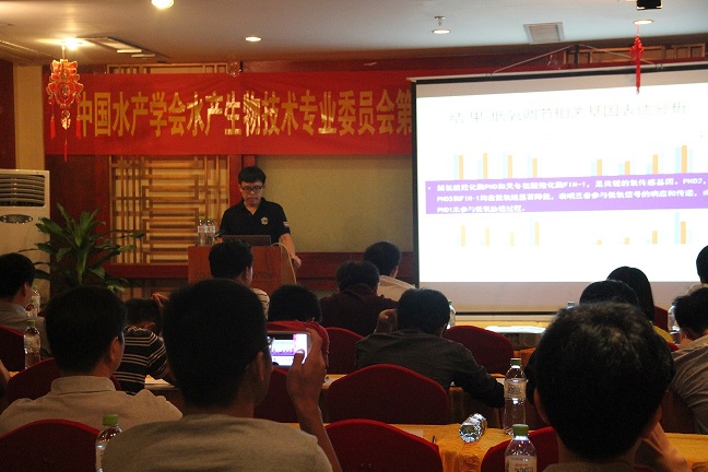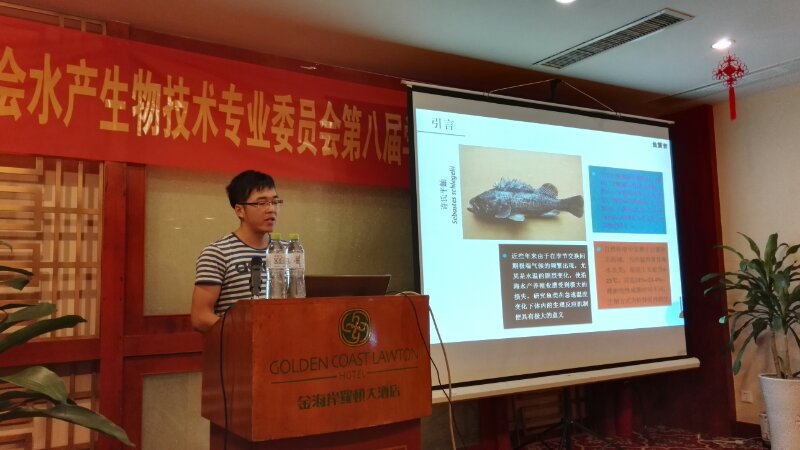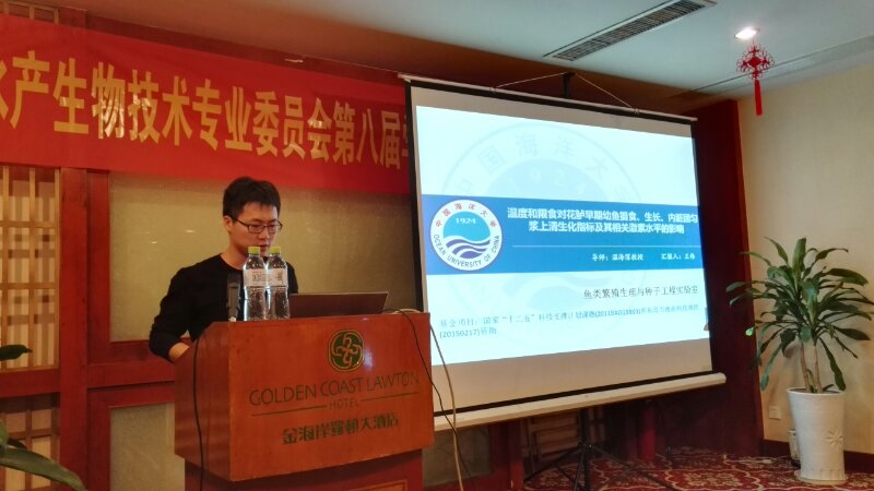 分别做了大会交流报告。 1、温海深:卵胎生鱼类繁殖生理机制研究 2、何峰:鲆鲽鱼类经济性状相关基因组表观遗传学分析 3、任源远:西伯利亚杂交鲟响应低氧胁迫的生理及分子机制初步研究 4、张晓燕:不同盐度条件下花鲈肝脏转录组学特性的初步研究 5、王伟:温度和限食对花鲈(Lateolabrax maculatus)早期幼鱼摄食与生长的影响 6、赵吉:急性温度变化下雄性许氏平鮋血清代谢组的变化